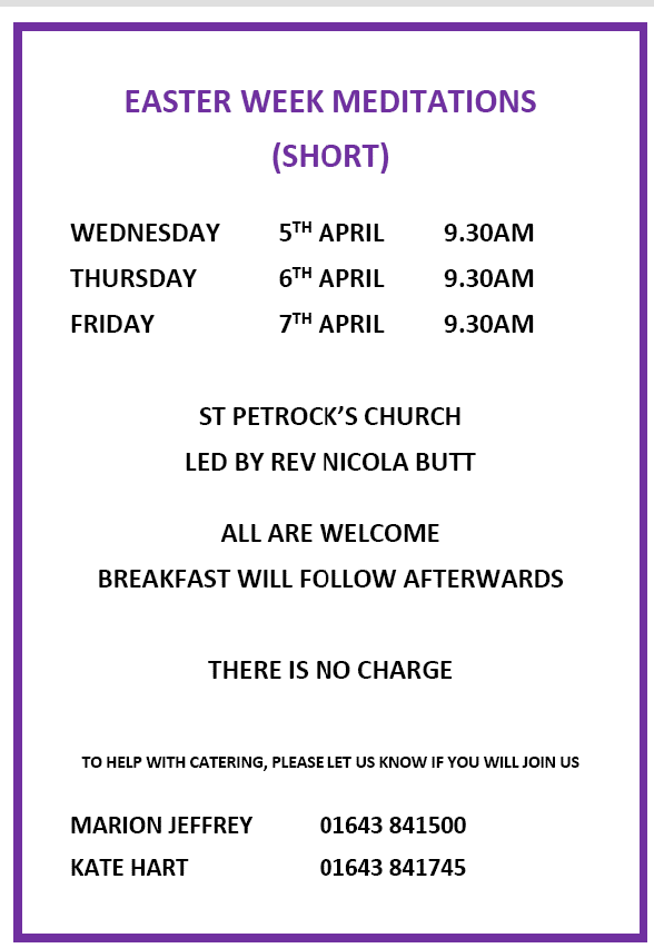 There will be a three day series of short meditations followed by breakfast. all welcome. Published on April 2, 2023 by stpetrock1 Share this: Email a link to a friend (Opens in new window) Email Print (Opens in new window) Print MoreTweet Share on WhatsApp (Opens in new window) WhatsApp Like Loading... Related