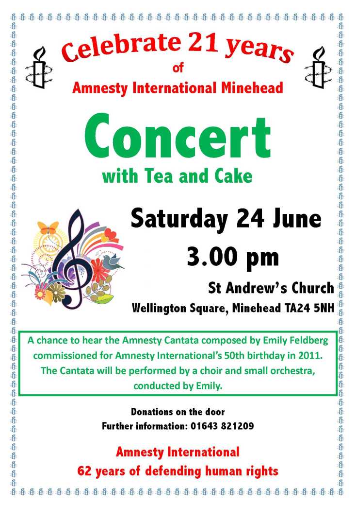 All Amnesty supporters and their friends are invited to join the Minehead Amnesty group for an afternoon concert and tea on Saturday 24 June 2023 at 3 pm in St Andrew’s Church, Wellington Square, Minehead TA24 5NH.