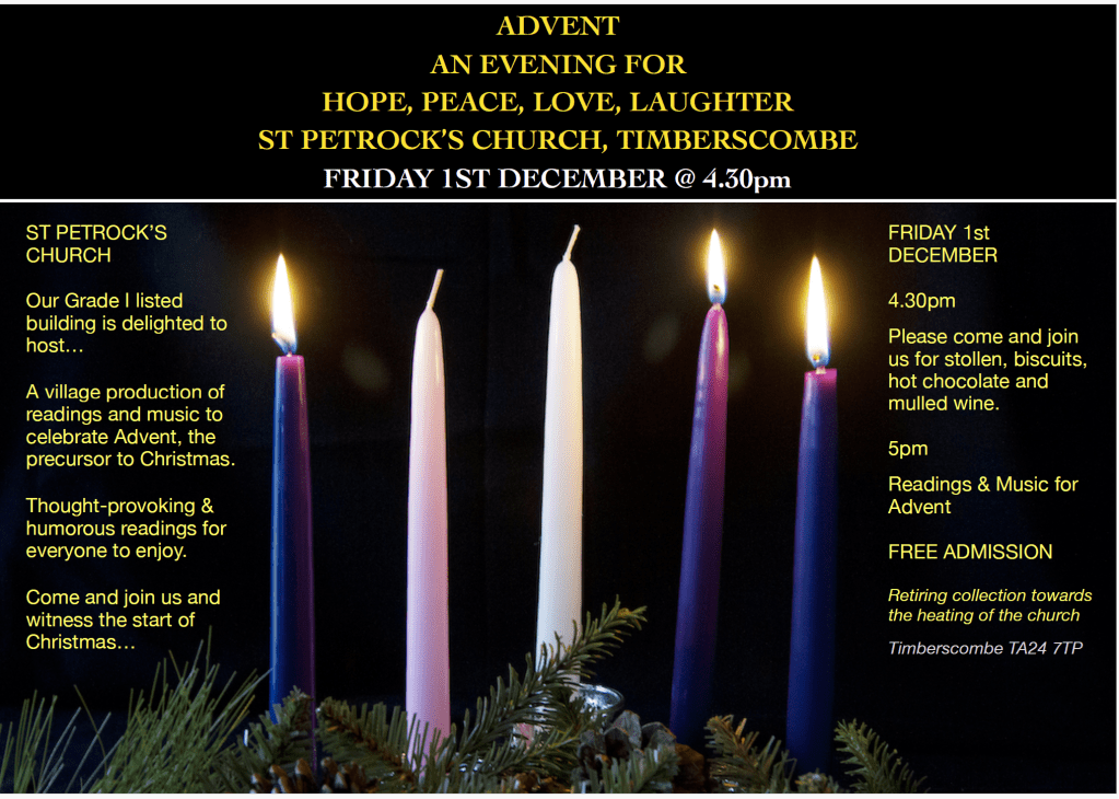 Join us in an early-evening village production of readings, poetry, music and lots of humour in St Petrock’s Church, once again orchestrated by Allan Sutton and with the support of talented village readers and performers. Delicious seasonal nibbles and refreshments are to be enjoyed alongside a candle-lit church with our Christmas tree to welcome you in and a convivial atmosphere to embrace the start of the festive season. There will be a retiring collection.