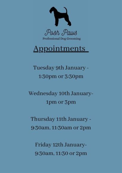 Dog Grooming Published on January 9, 2024 by Lesley Webb I hope everyone has had a lovely Christmas & New Year ! Here are some appointments I have available this week- message me to book Share this: Click to email a link to a friend (Opens in new window) Email Click to print (Opens in new window) Print MoreTweet Click to share on WhatsApp (Opens in new window) WhatsApp Like Loading... Related