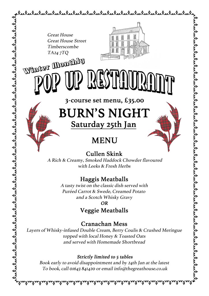 Our January pop up supper is of course Burns night, Sat 25th, please book early as this is always very popular.