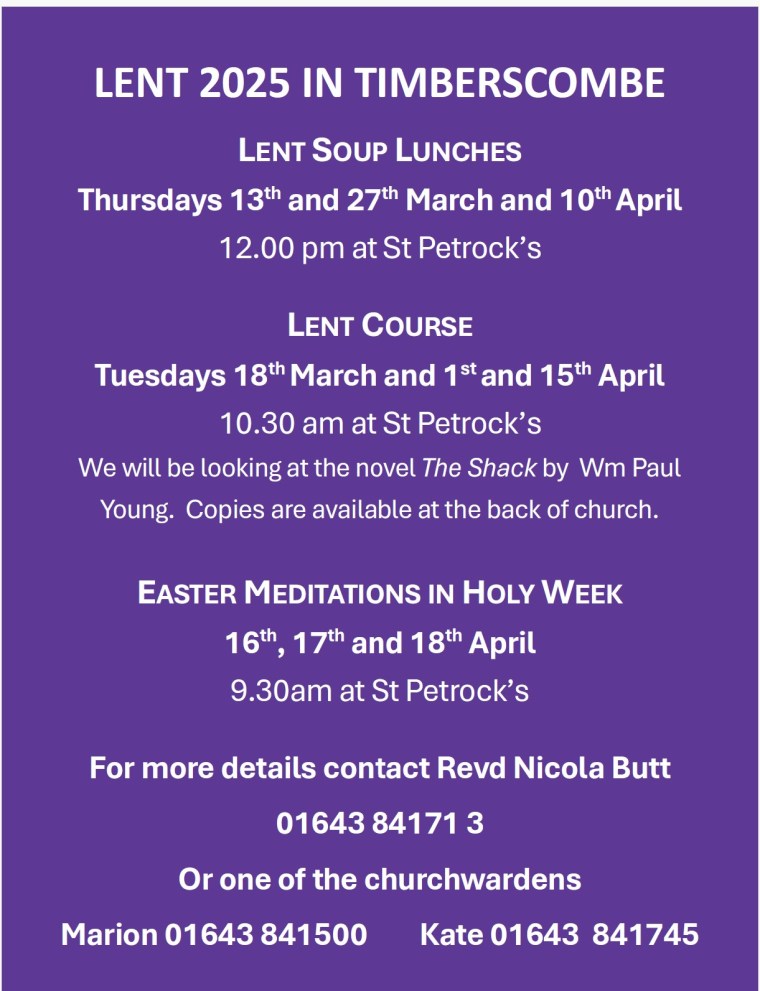 Lent in Timberscombe. See below for full details. Our second Lent Lunch – soup and rolls – will be held in St Petrock’s Church on Thursday 27th March immediately after the Warm Welcome. There is no charge, any voluntary donations will go to the UNCHR Sudan crisis fund. All are welcome.