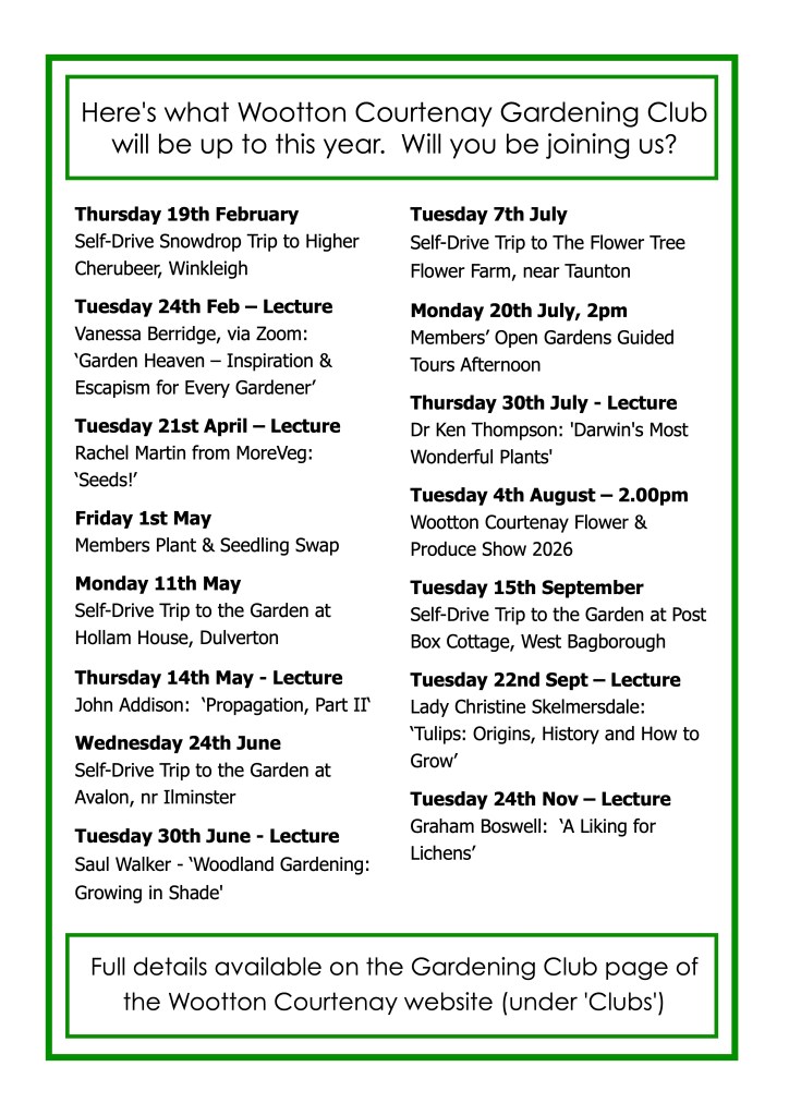 Wootton Courtenay Gardening Club has a lively line-up of events this year, with something for everyone. We welcome new joiners, whether novice gardeners or green-fingered wizards! Membership costs just £10 per year (please note – membership does not include the cost of trips).