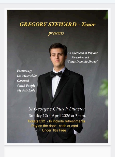 There is also attached a flyer about a lovely singing recital at St George’s Dunster on 12 April at 3pm, and another about a poetry reading with art evening at St Petroc’s, Timberscombe on 27 April at 6.30pm – both well worth going to!
