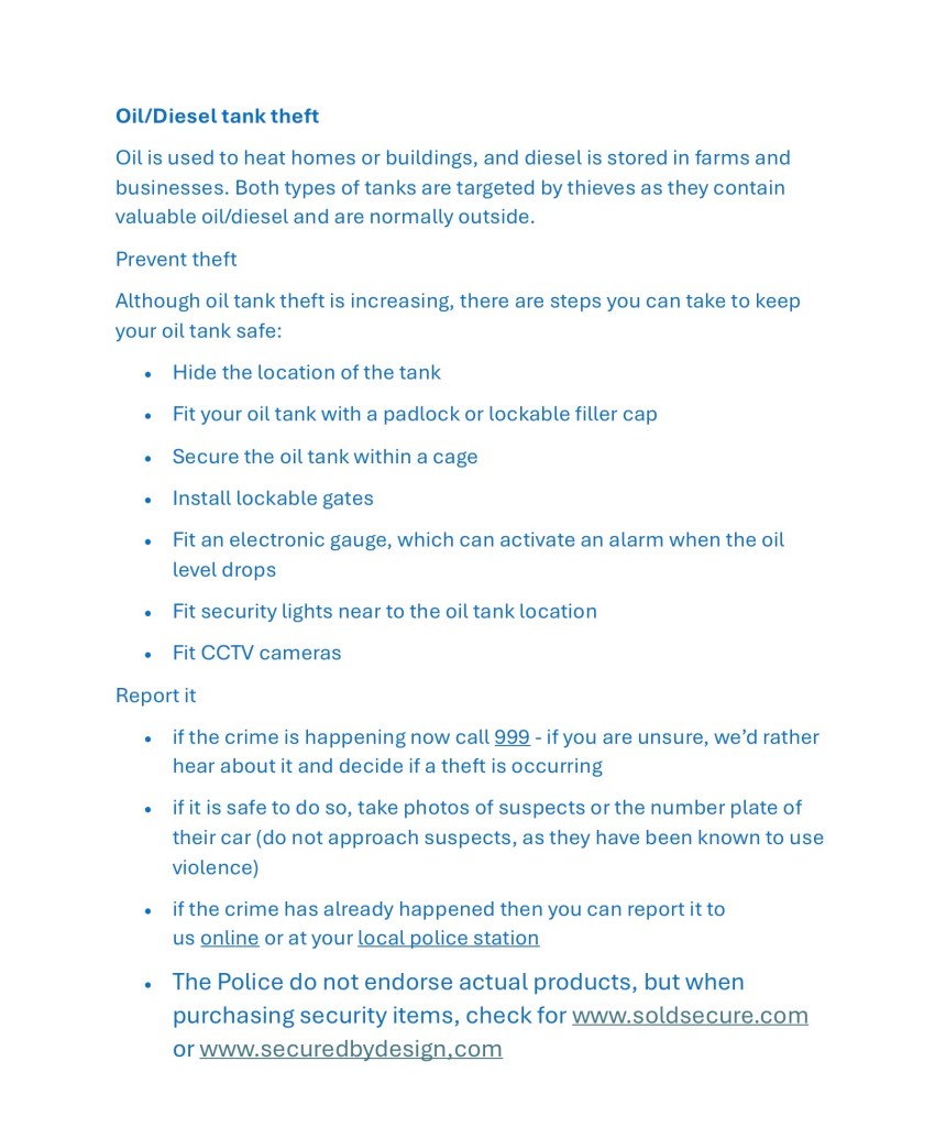 There have also been some fuel thefts recently. The Police have issued this advice to the public
