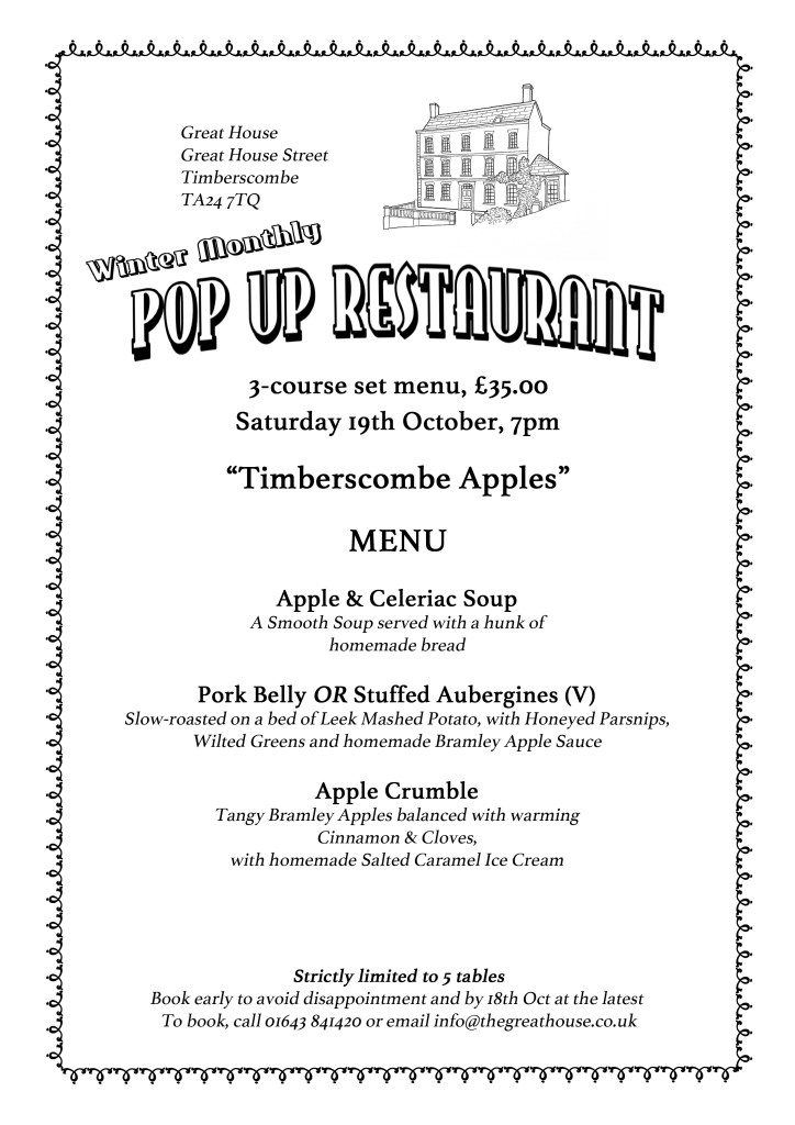We are starting our Winter Pop up this Saturday night at The Great House.