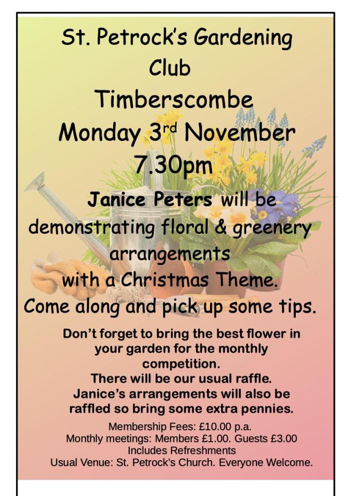 Don’t Forget The Gardening Club Meeting Monday 3rd November Published on October 29, 2025 by St Petrock's Gardening ClubLeave a comment Share this: Click to email a link to a friend (Opens in new window) Email Click to print (Opens in new window) Print MoreTweet Click to share on WhatsApp (Opens in new window) WhatsApp Like Loading...