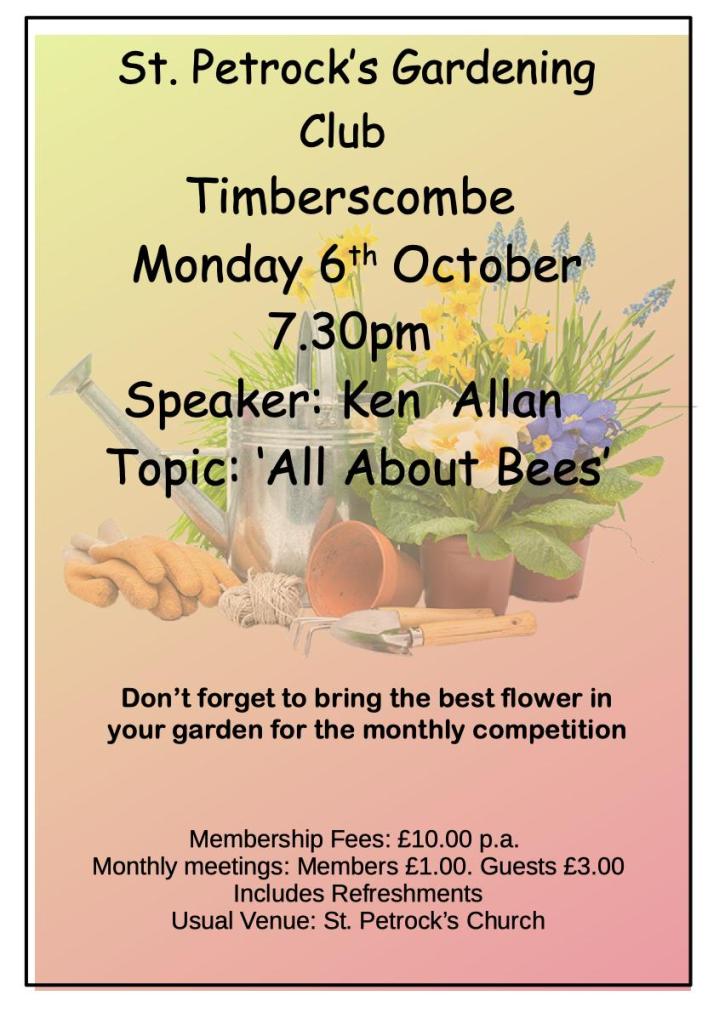 Garden Club Published on October 1, 2025 by St Petrock's Gardening ClubLeave a comment Don’t forget the Garden Club meets Monday 6th October. It’s all about bees. Share this: Click to email a link to a friend (Opens in new window) Email Click to print (Opens in new window) Print MoreTweet Click to share on WhatsApp (Opens in new window) WhatsApp Like Loading...