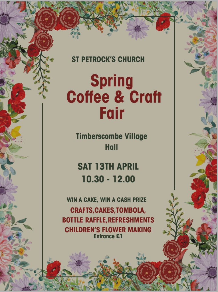 This coffee morning with delicious cakes to buy and with local crafting talent showing their wares is taking place on the morning of Saturday 13th April in the Village Hall. Do come along and enjoy refreshments, our raffles and quiz, childrens’ craft making and other temptations. It’s all in a good cause, to support our village church and keep it open, safe and welcoming to everybody. We hope to see you there!