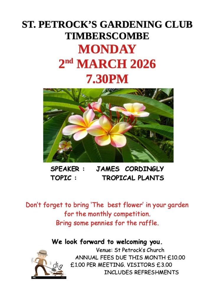 The New season of the Club commenced on Monday 2nd March 2026, when our speaker, James Cordingly, Head Gardner, Dunster Castle, enlightened a small, but enthusiastic, group about sub tropical plants, and his time in Herm [Channel Islands] as he began his career after leaving college.