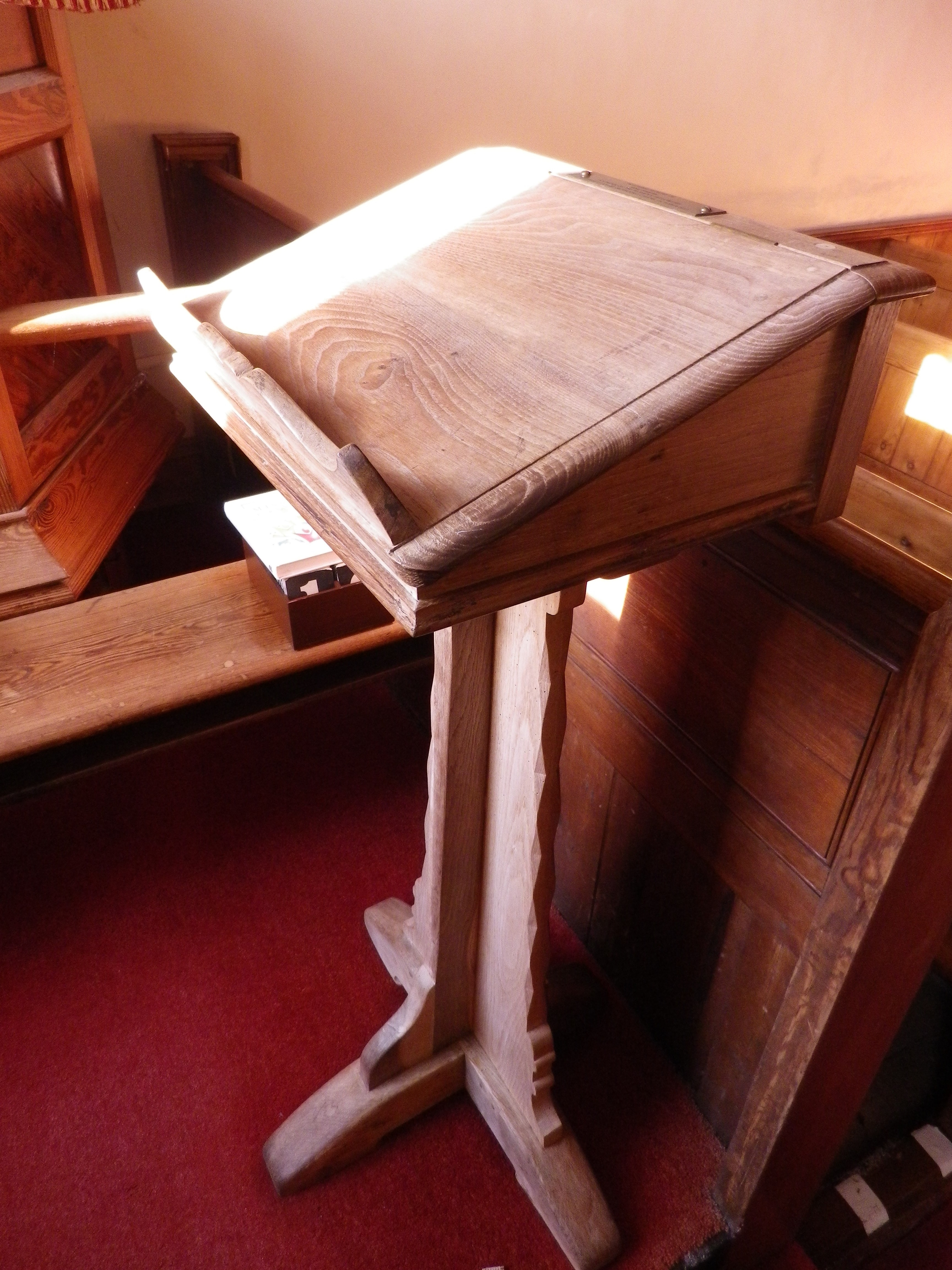 The lectern was made by local craftsman Mr W. Schofield and is dedicated to Mrs Jane Martin, founder of the Women’s Fellowship, in October 1952.