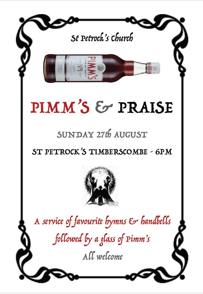 Pimm’s and Praise – everyone welcome this sunday at 6pm Published on August 21, 2023 by stpetrock1Leave a comment Share this: Email a link to a friend (Opens in new window) Email Print (Opens in new window) Print MoreTweet Share on WhatsApp (Opens in new window) WhatsApp Like Loading...