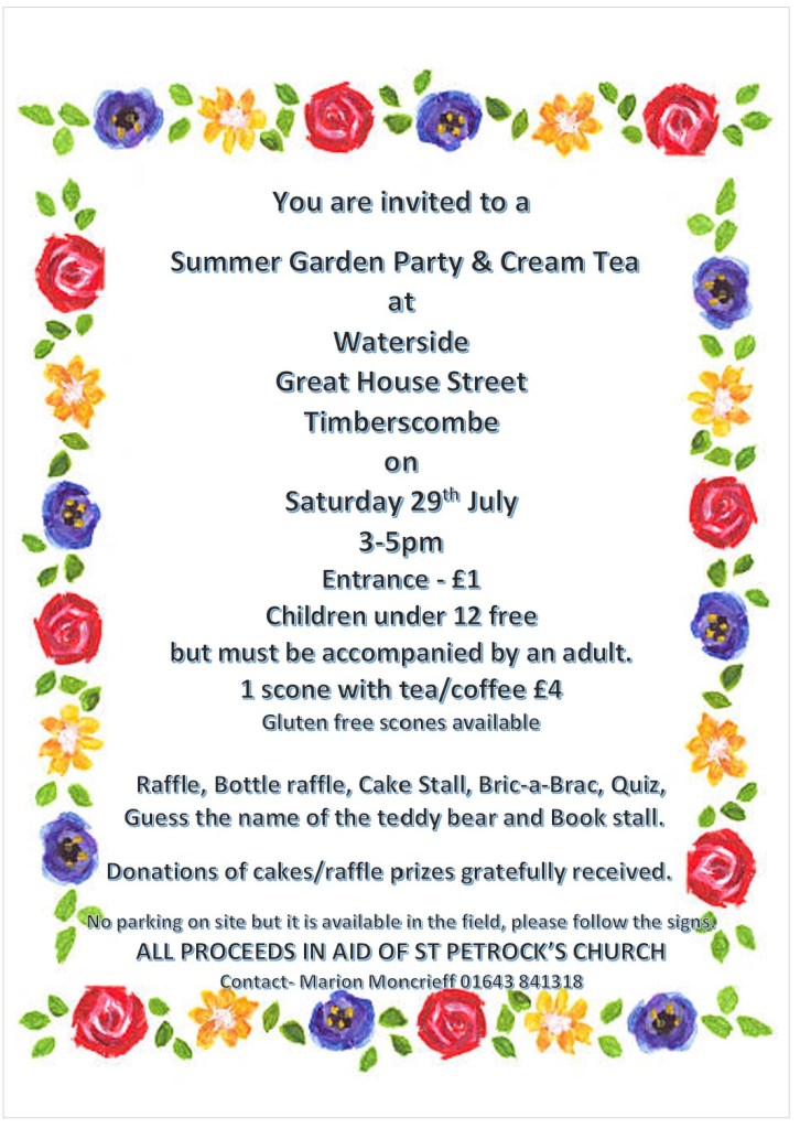Village summer garden party at Waterside -details below. All welcome! Published on July 4, 2023 by stpetrock1Leave a comment Share this: Email a link to a friend (Opens in new window) Email Print (Opens in new window) Print MoreTweet Share on WhatsApp (Opens in new window) WhatsApp Like Loading...